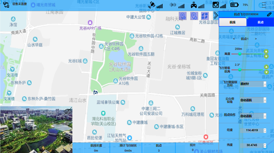 航點規劃與PC端飛控軟件功能類似,提供點擊地圖設置航點的功能,航點設置完畢后可以將航點(航線)信息同步到PC端,App端航點規劃將會顯示設備連接狀態、GPS信號、視覺系統、遙控器信號、圖傳信號、電池電量等信息,下方會顯示航線長度、預計飛行時長、航點及圖片數量信息。
